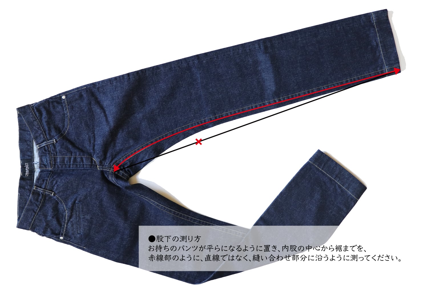 採寸方法は、お手持ちのパンツを写真のように平らになるように広げて、股下の中心部分より縫い目に沿って裾まで測ってください。